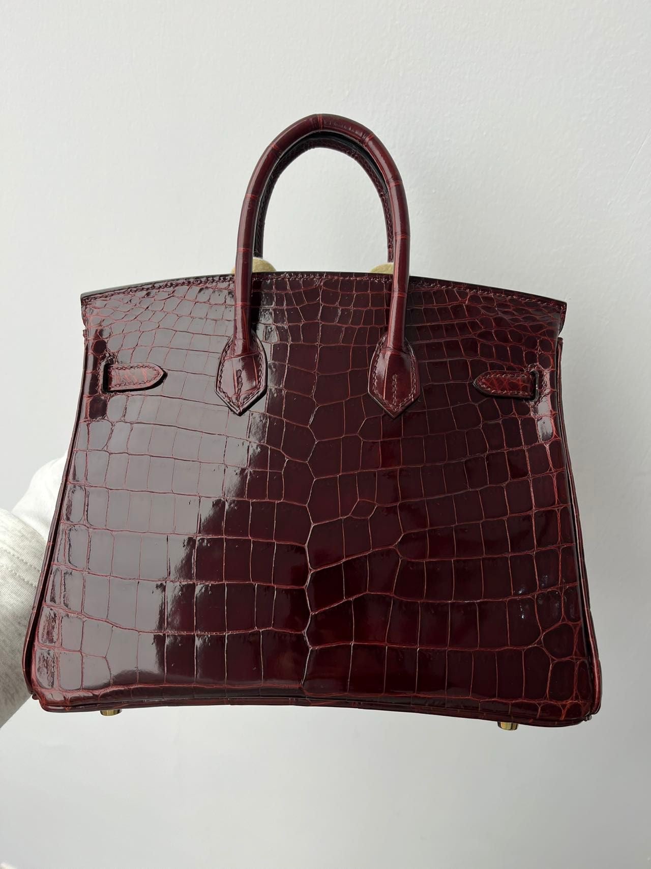 Hermes Birkin 25 Red Bordeaux shiny crocodile leather gold hardware