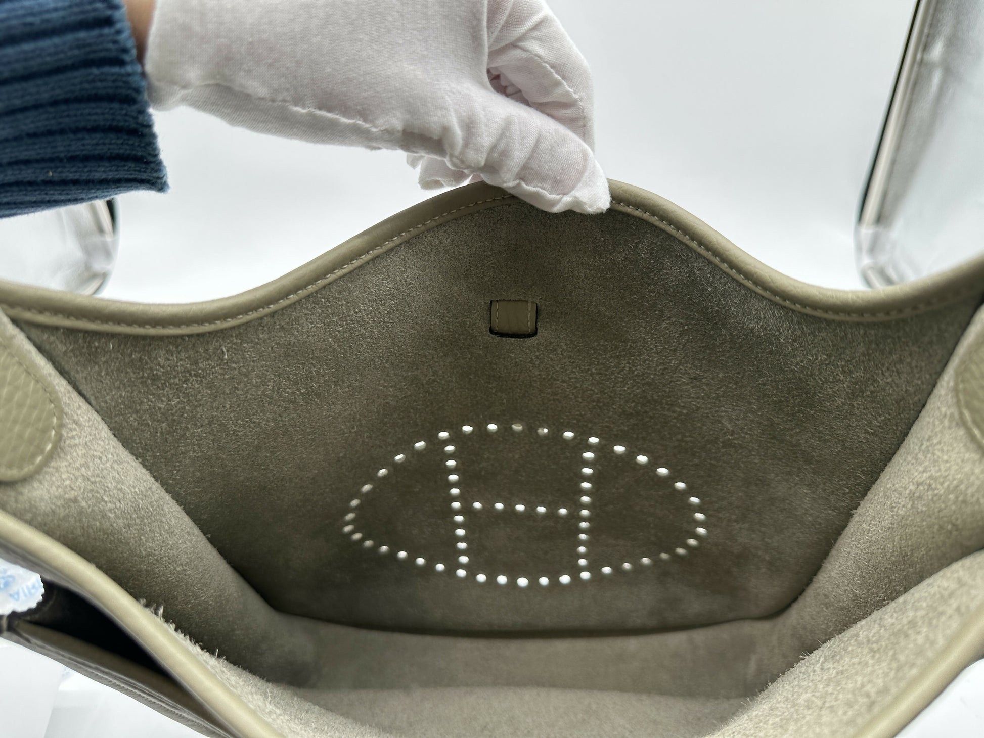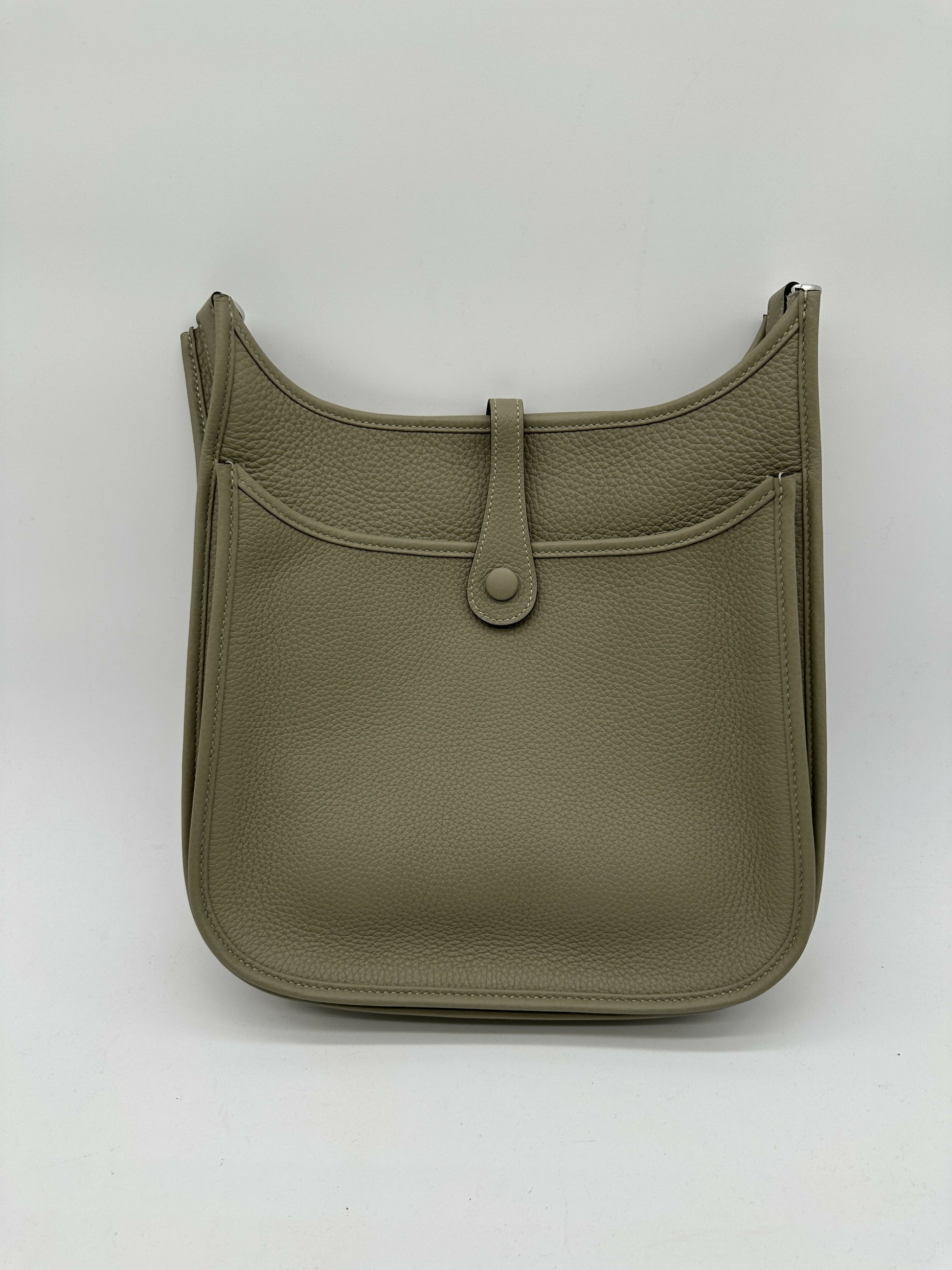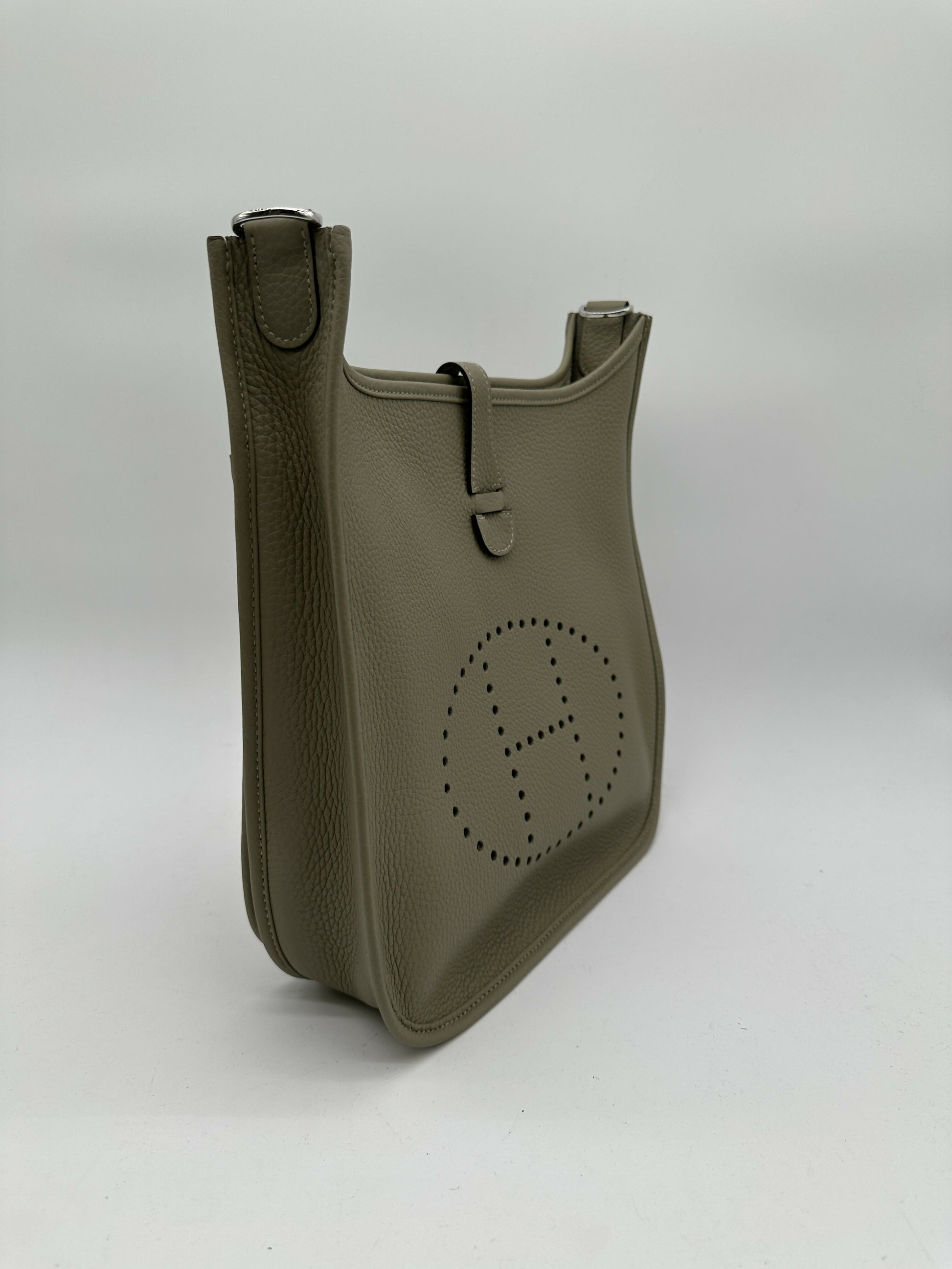 The Hermès Evelyne III 29 in Sauge with palladium hardware, stamp W, is a casual yet elegant messenger bag crafted from supple leather for everyday versatility. The soft green shade of Sauge lends a refined and contemporary touch, while the signature perforated H detail and adjustable canvas strap highlight its effortless, functional design, making it a chic companion for relaxed sophistication.