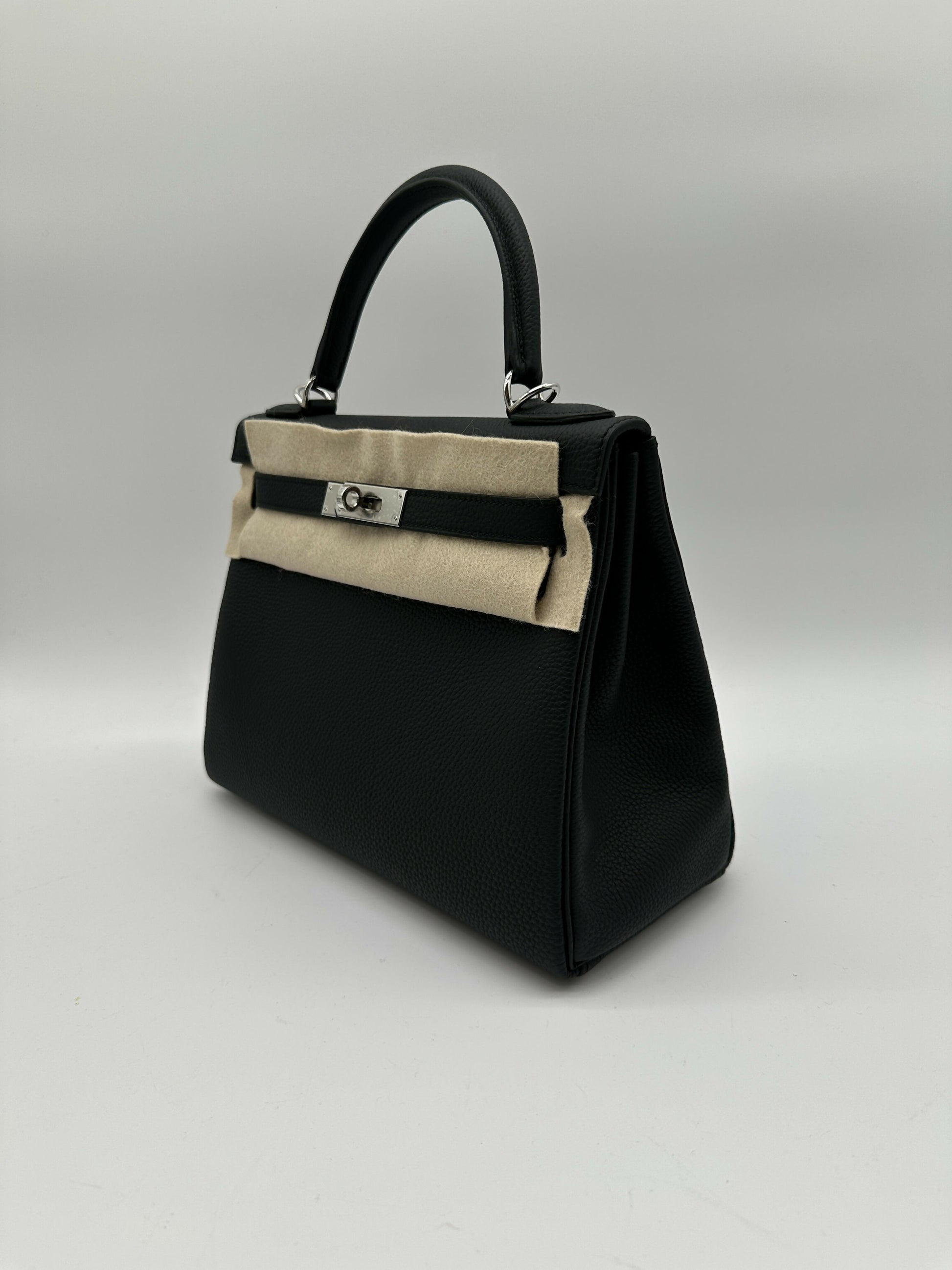 A Hermès Kelly 28 in black Togo leather with gold plated (PHW) hardware and stamp “K” — a sleek, versatile classic. The softly grained, durable Togo body carries a structured but slightly relaxed silhouette; contrasted by elegant gold fittings and the discreet date stamp “K,” this piece combines everyday sophistication with Hermès heritage.