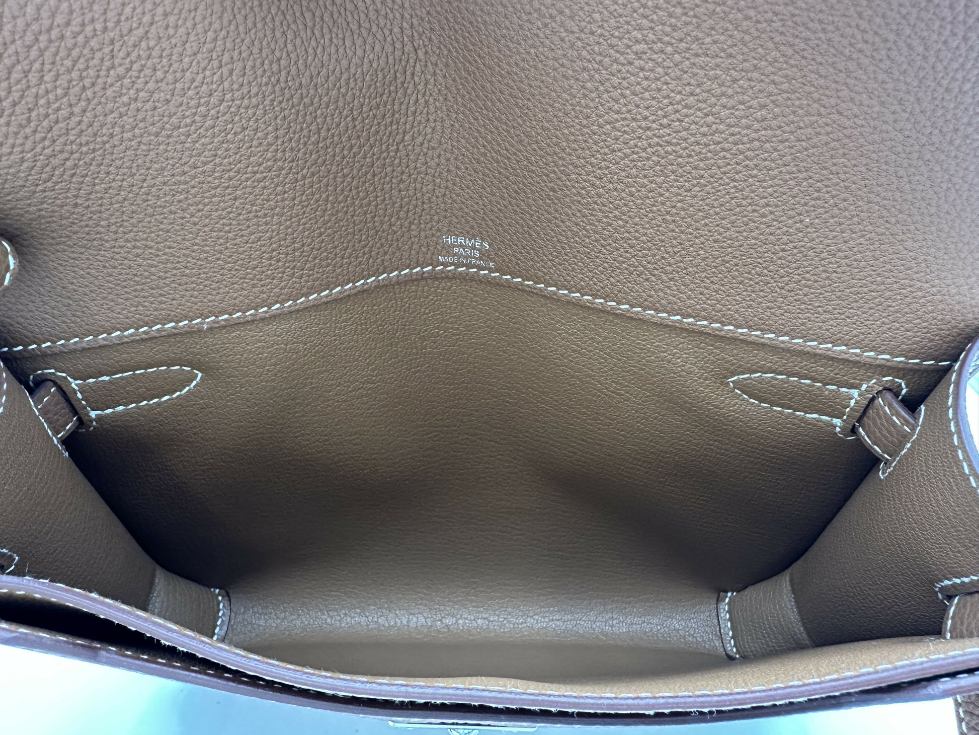 The Hermès Kelly Dépêches 25 in Gold with palladium hardware, stamp K, is a refined briefcase-style clutch that embodies timeless sophistication. Crafted in the house’s signature Gold leather, its structured form is accented by sleek palladium hardware, creating a perfect balance of elegance and utility. Compact yet commanding, this 25 cm design offers a versatile accessory for both professional and formal occasions.