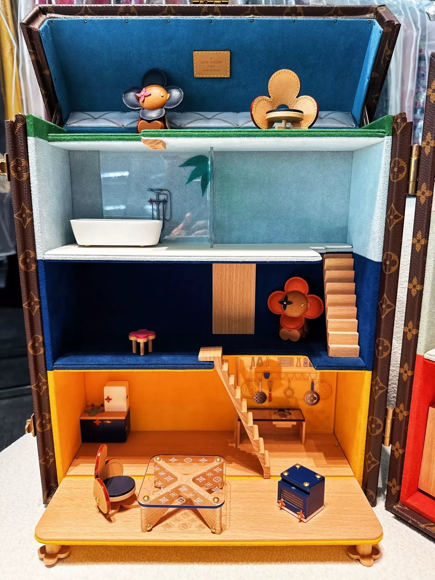 The LV Louis Vuitton Vivienne Dollhouse Suitcase is a masterpiece of luxury design, featuring a sturdy hard-shell suitcase with an ultra-delicate interior decoration. Its double-layer design includes solid wood stairs and furniture, as well as a blue and red room adorned with small flower decorations, a hammock, and a dressing table. With measurements of 35.2*43.2*25.6, this unused dollhouse suitcase is the perfect addition to any collection or gift for a loved one.