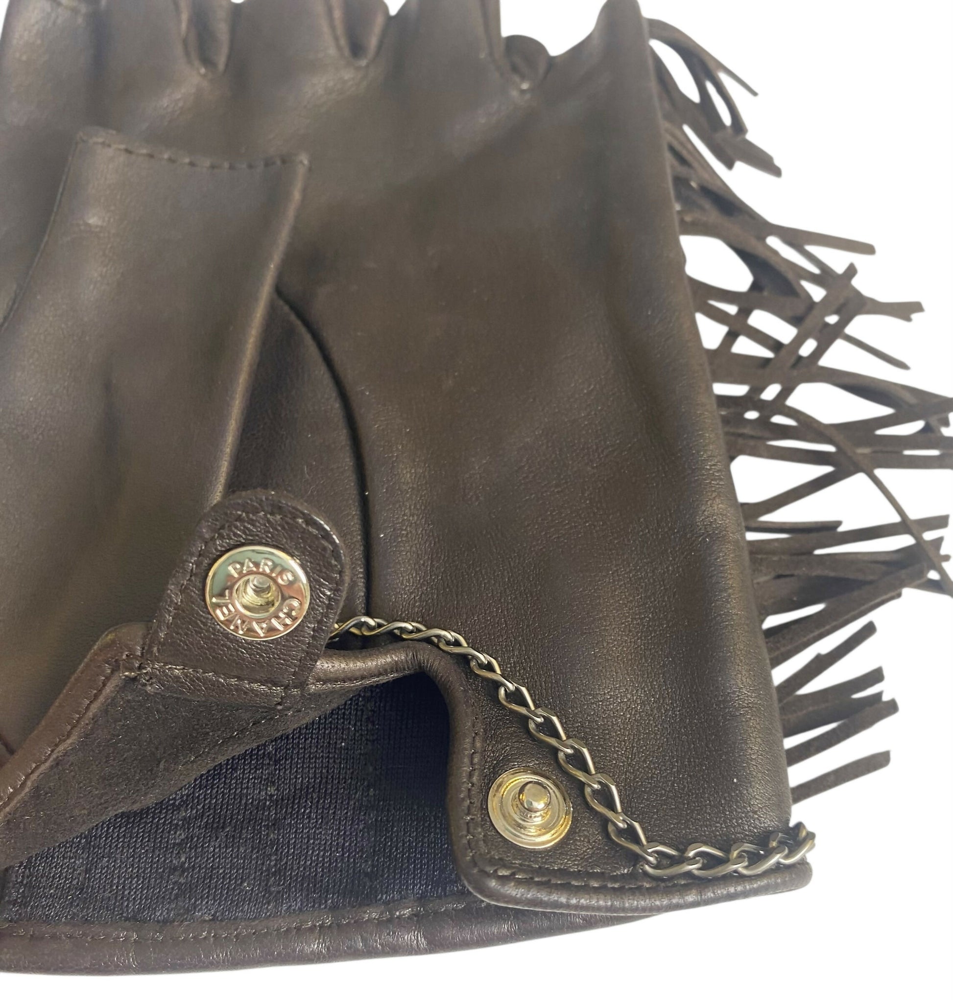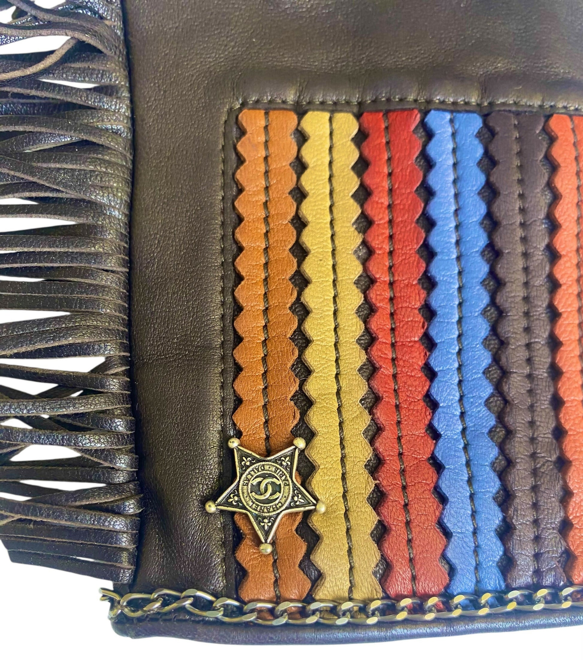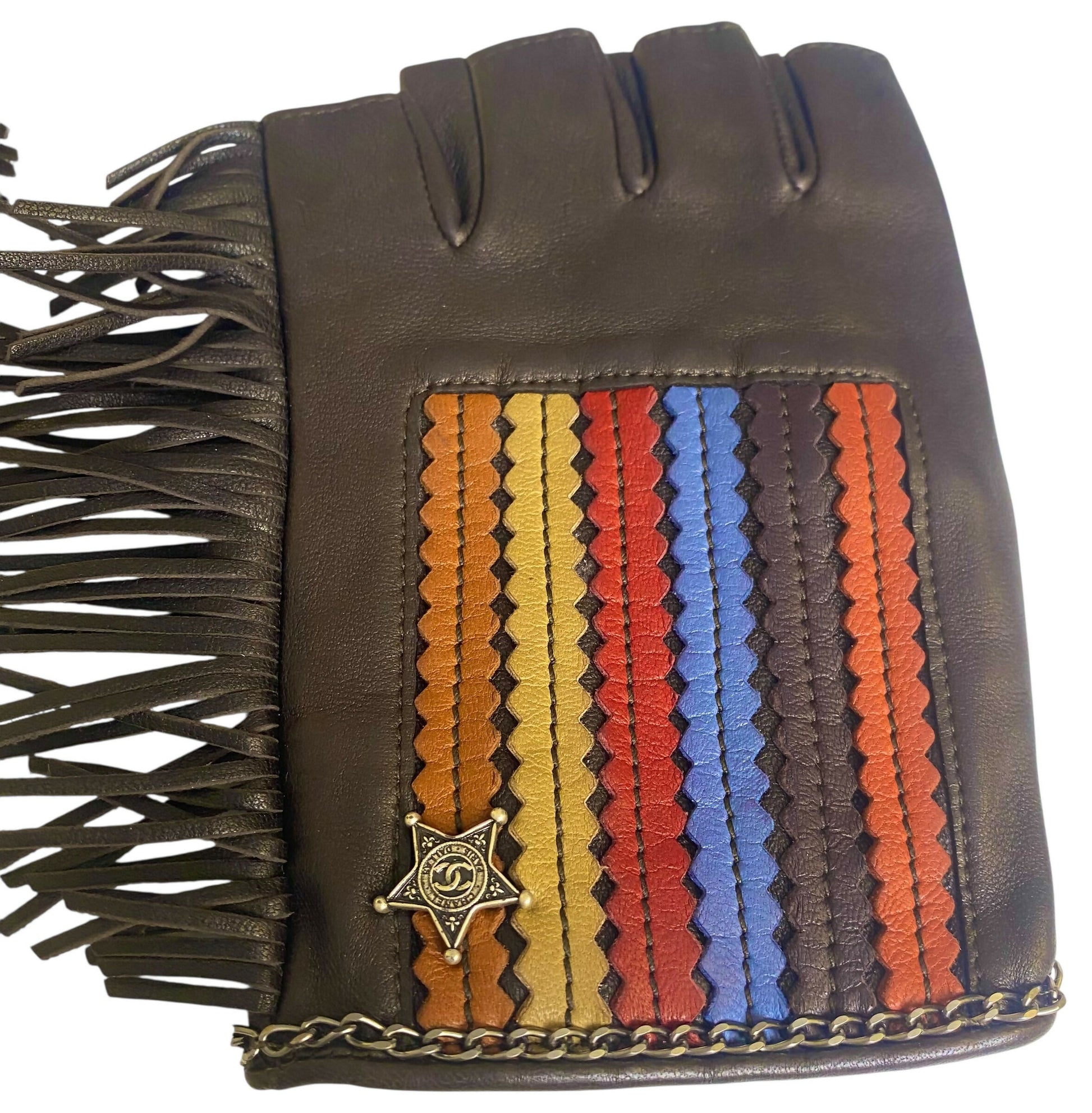 This is a pair of Chanel fingerless gloves in soft brown Lambskin leather feature colorful stripes, fringe, silver chain detail around the wrist with CC Snap Closures, and a metal star with Chanel Paris-Dallas CC.