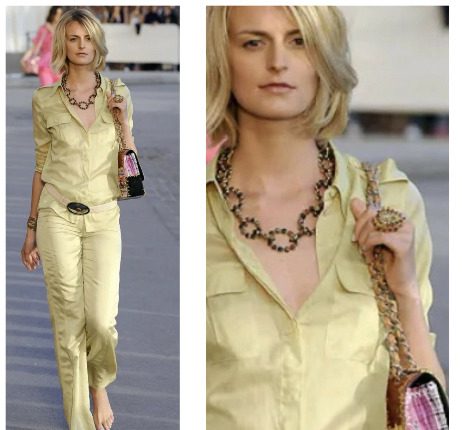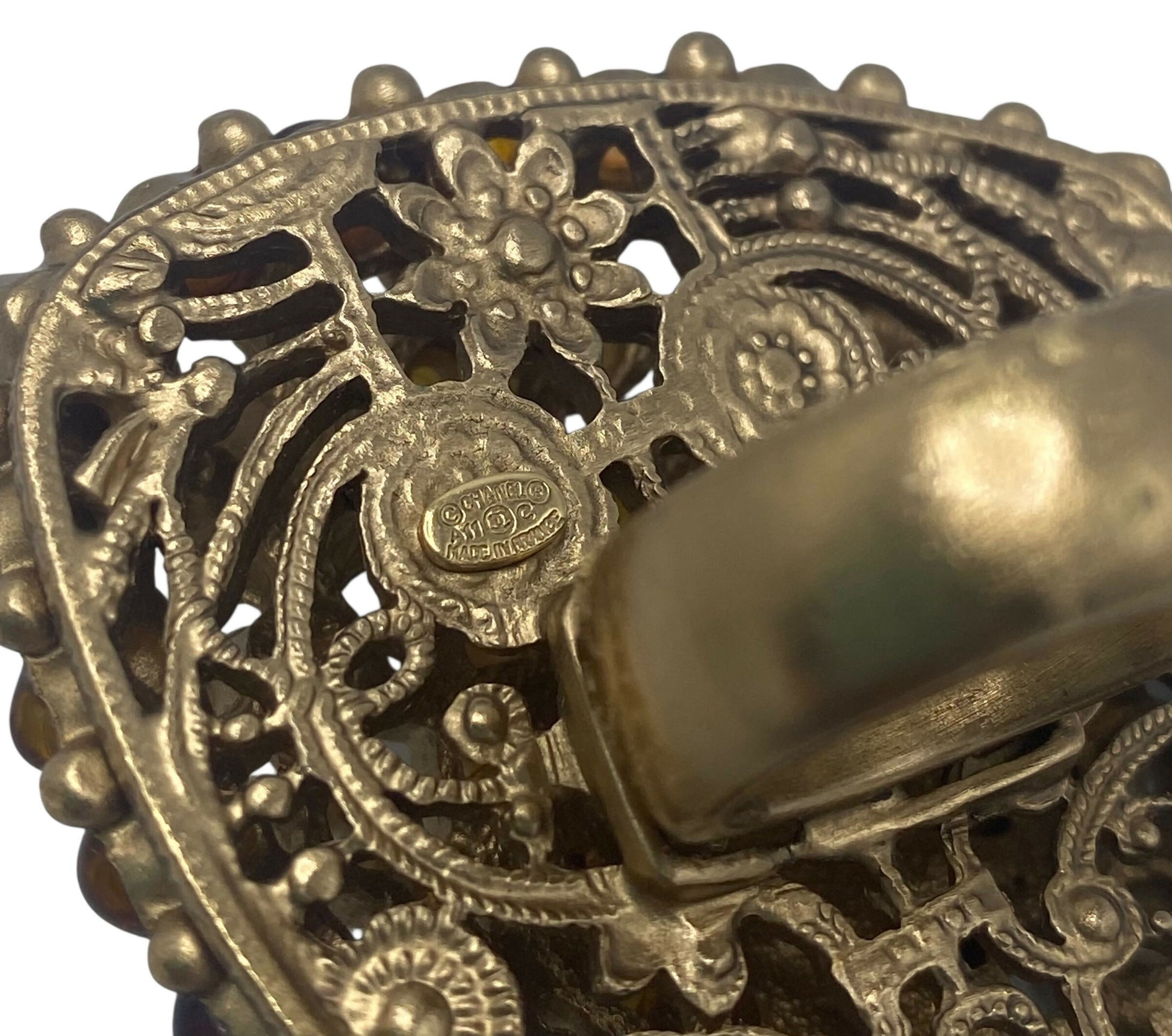 This XL Chanel ring is Rare and Exquisite in Gold Tone Metal, Covered with brown tones gripoix stones, pearls and a CC logo. Gold CC at side of the ring. Intricate metal detailing on underside of this ring.