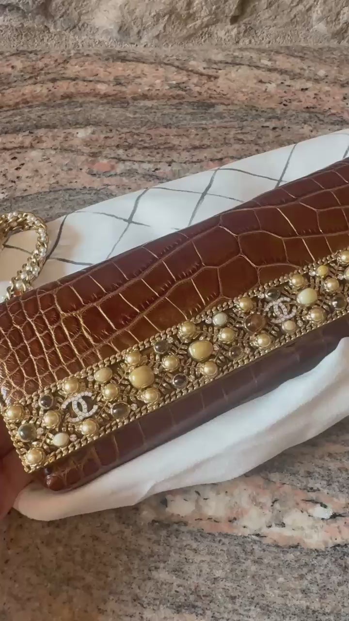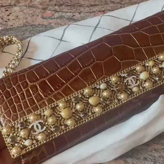 This exquisite Rare Chanel 2009 Pre-fall Paris Moscow Honey Brown alligator evening bag exudes elegance and luxury. Embellished with gold hardware and pearls, this rare piece is a true testament to Chanel's craftsmanship. A must-have for fashion enthusiasts and collectors alike.