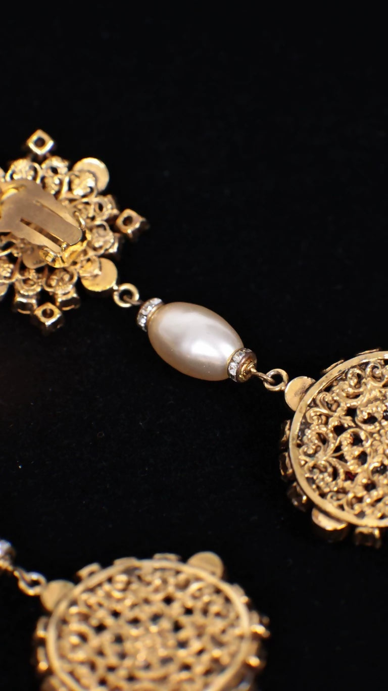 Vintage Chanel 1990s Red and Green Glass Rhinestone Pendant Pearl Clip-on Earrings