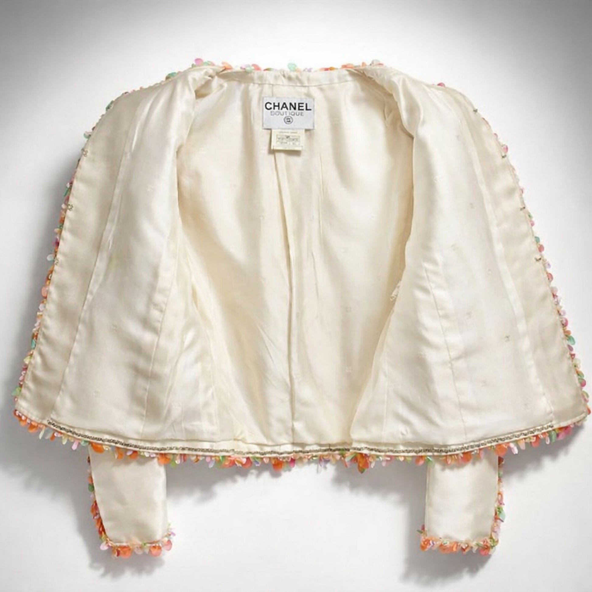 Vintage Chanel 96P Barbie Ivory Shantung Silk Sequin Beaded Pallets Jacket FR 42